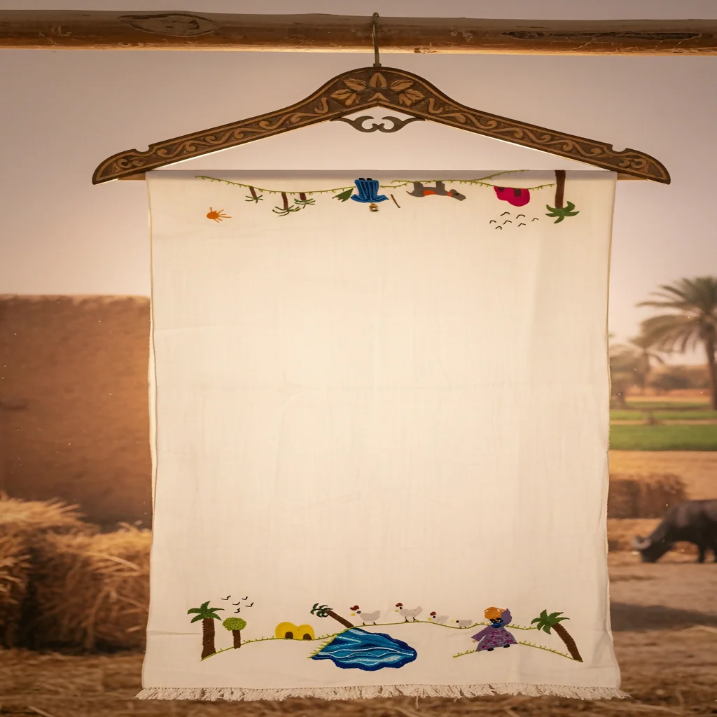 Experience the charm of Egypt’s countryside with the Hikayet El Reef shawl from Eraath — a unique, hand-embroidered piece crafted by skilled artisans using a luxurious blend of linen and natural fiber from the vibra plant. This Egyptian rural shawl brings to life the beauty of daily scenes in the countryside: tall palm trees, wide green fields, and the warm simplicity of rural life. Every stitch reflects the authenticity of Egyptian heritage through vivid colors and precise craftsmanship. Whether worn as an elegant shawl or displayed as a decorative throw in your home, this piece tells a heartfelt story from the Egyptian land.