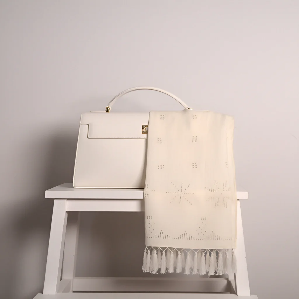 - Color: White with silver thread embroidery