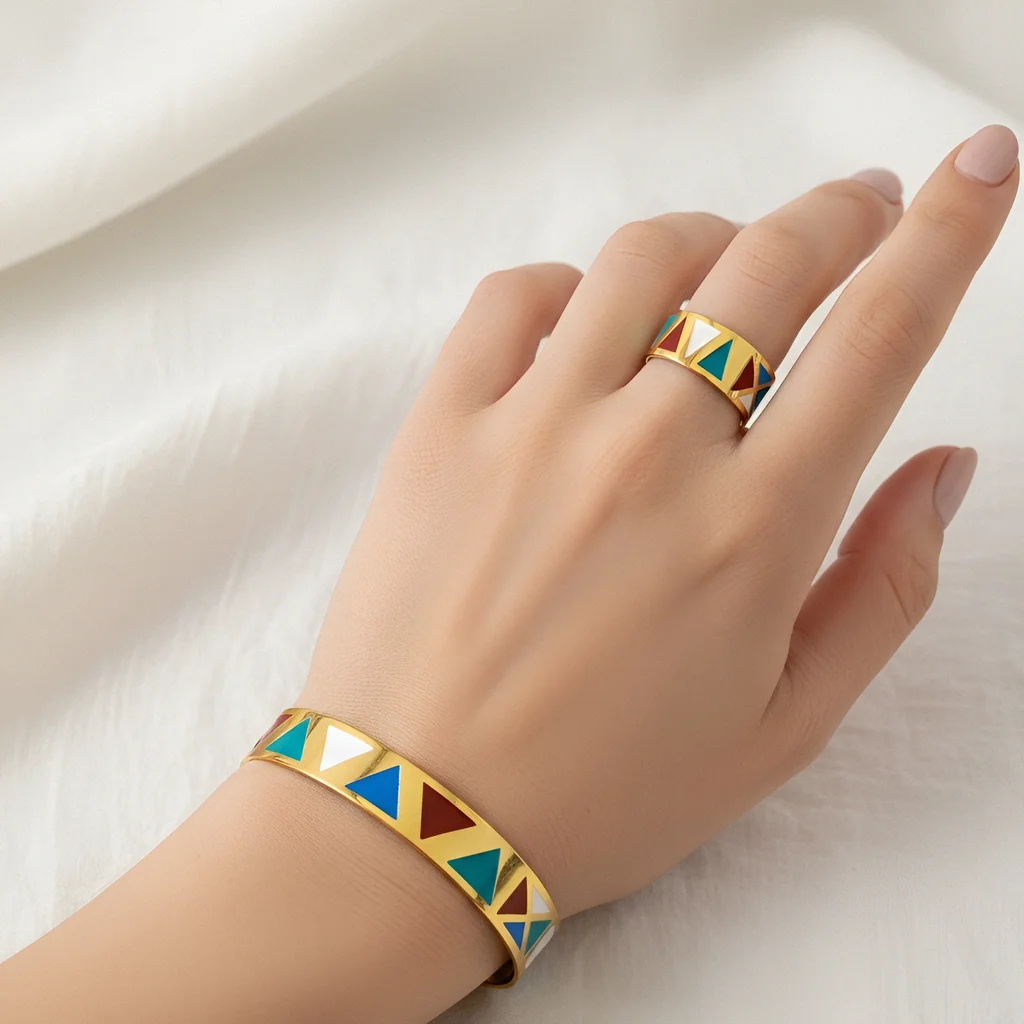 Handcrafted from 18k gold-plated brass with high-quality enamel colors, this set offers a unique look that blends modern elegance with the timeless charm of Nubian culture.